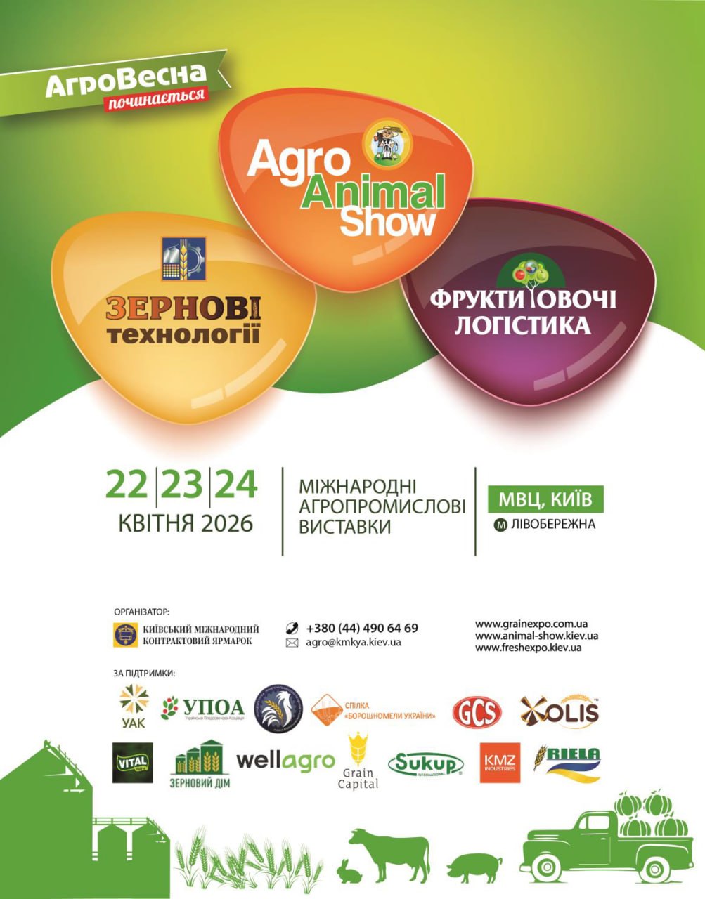 22-24 квітня 2026 року відбудуться міжнародні агропромислові виставки «Зернові технології 2026», Agro Animal Show 2026 та «Фрукти. Овочі. Логістика 2026», які об`єднують фахівців у галузях зернового господарства, тваринництва, птахівництва та плодоовочевої галузі.